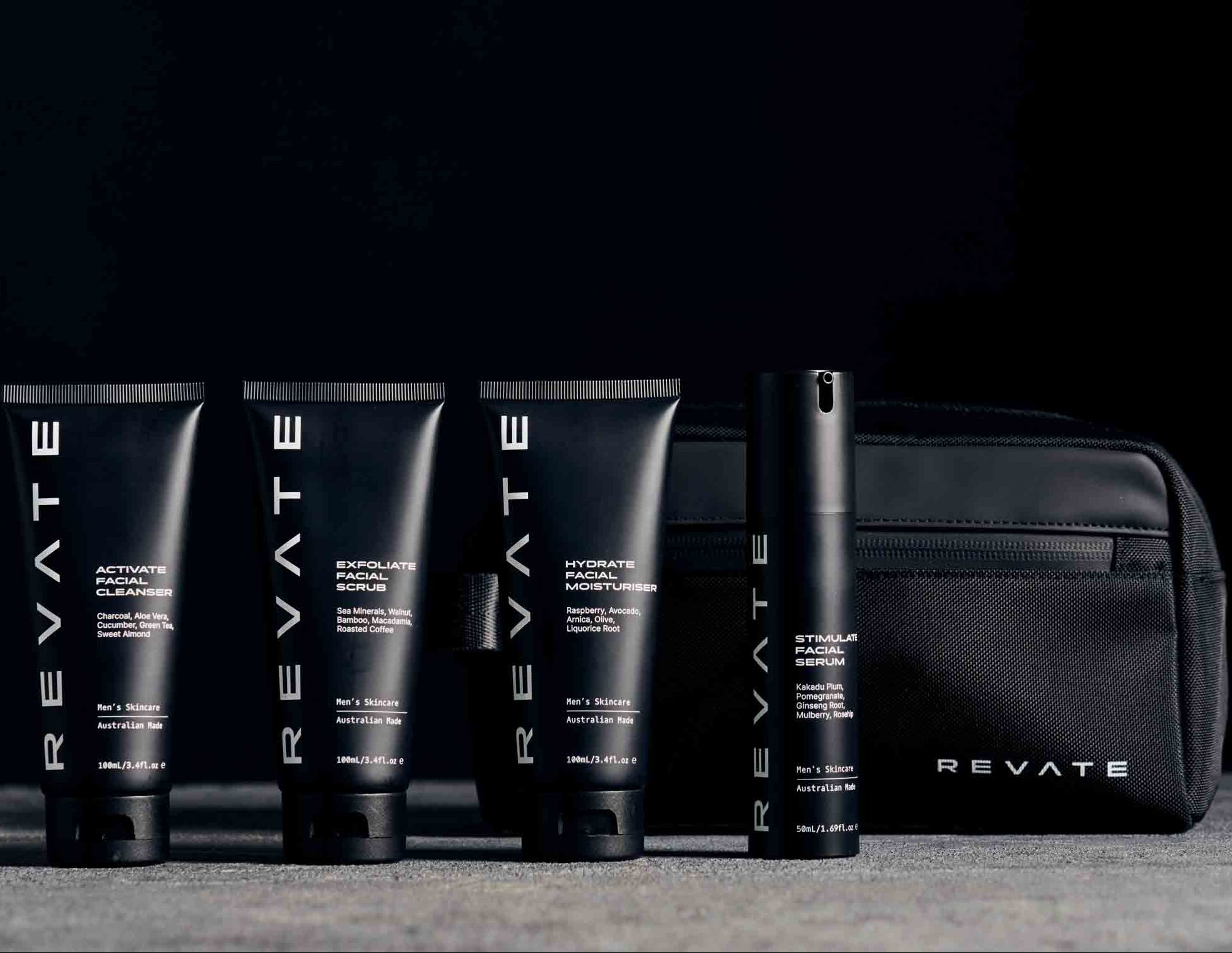 Achieve flawless skin with the ultimate Men's skincare set. Includes a premium travel bag, face towel and all four enhancing Revate products to take your skin to the next level.