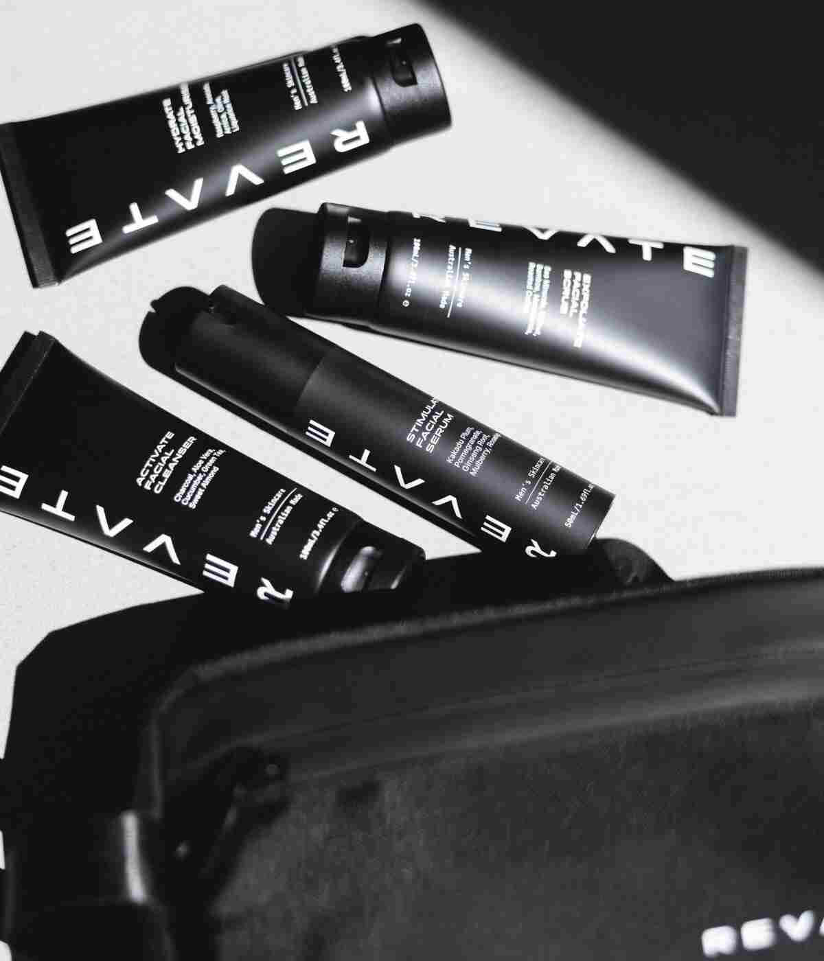 Achieve flawless skin with the ultimate Men's skin care set. Includes a premium travel bag and all four enhancing Revate products to take your skin to the next level.