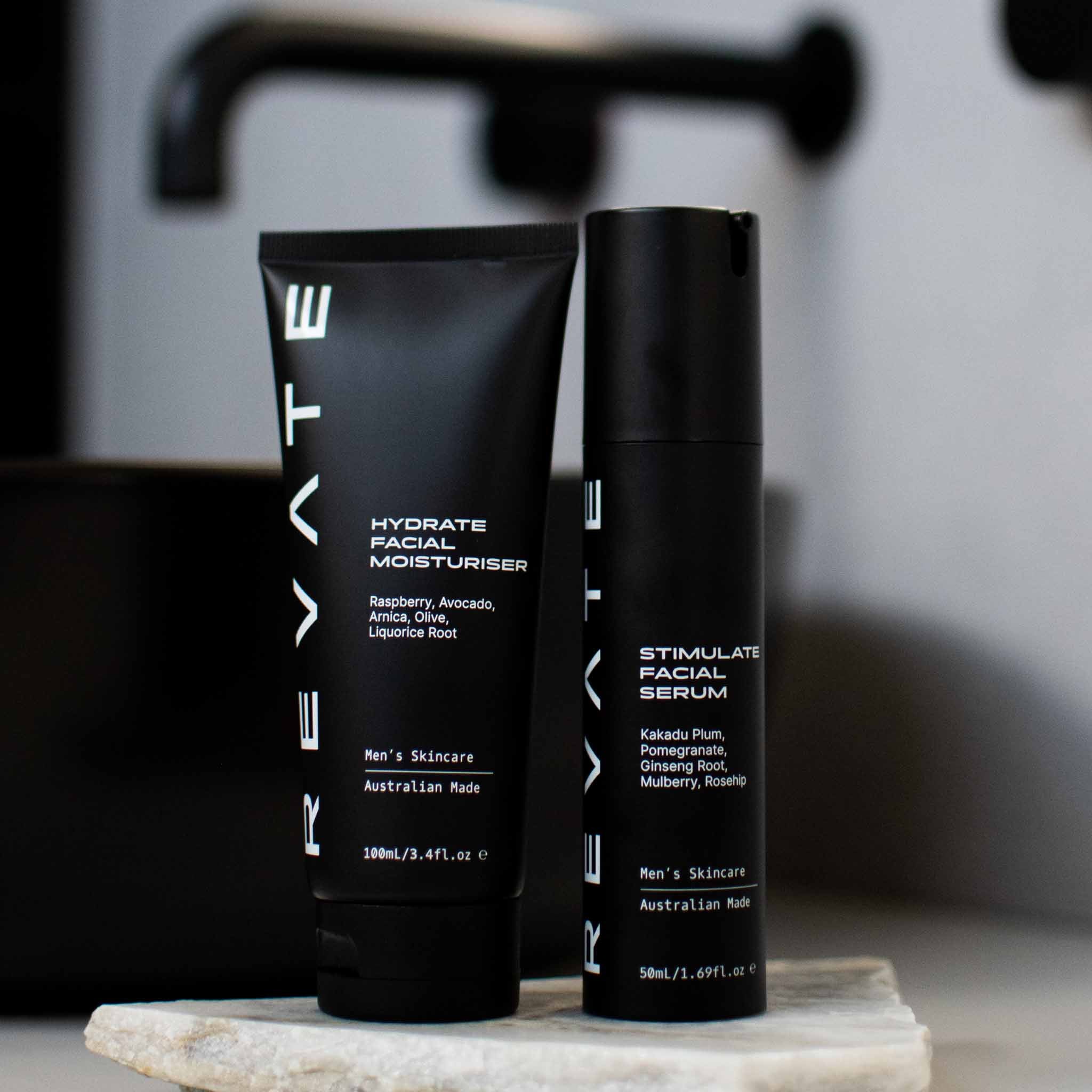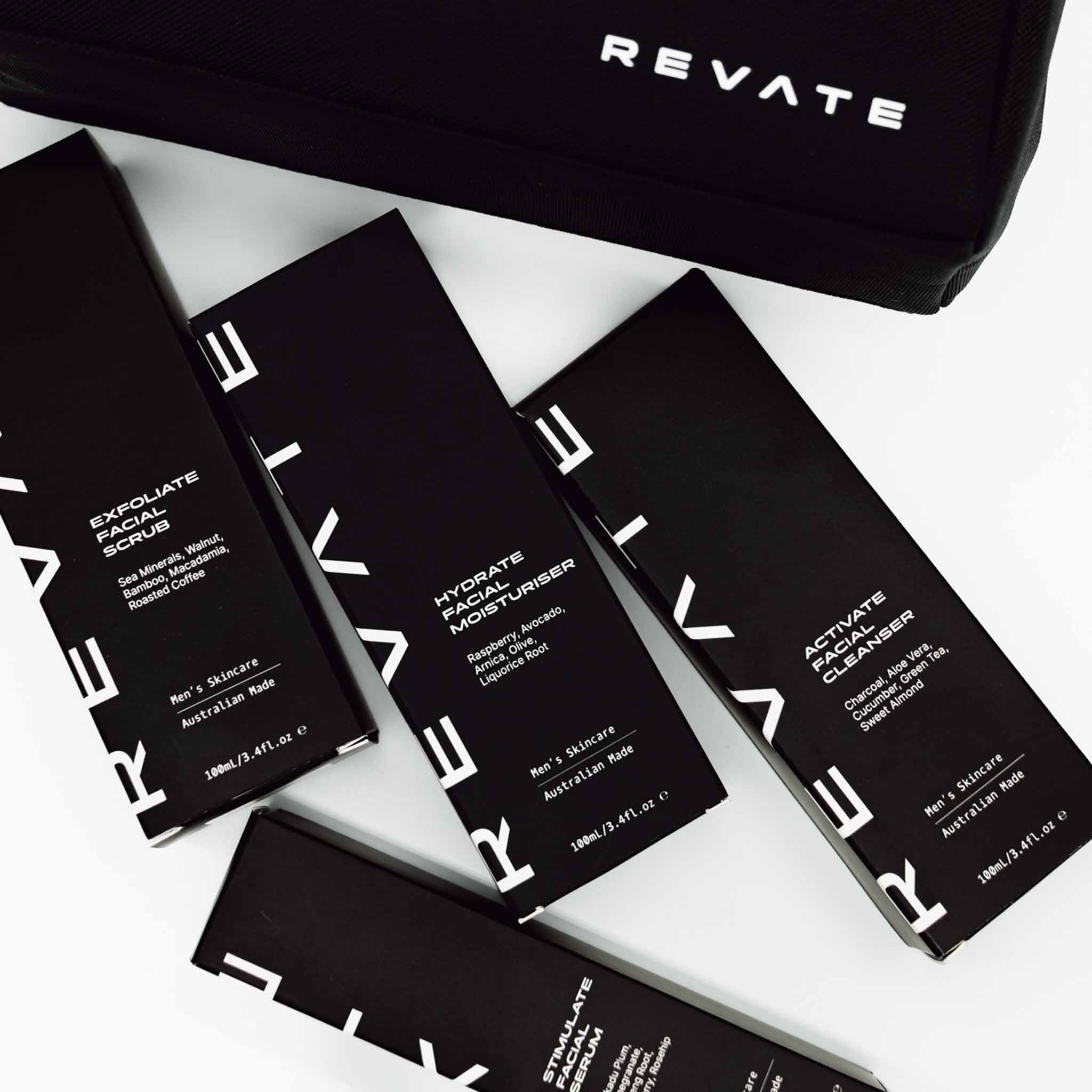 Achieve flawless skin with the ultimate Men's skin care set. Includes a premium travel bag and all four enhancing Revate products to take your skin to the next level.